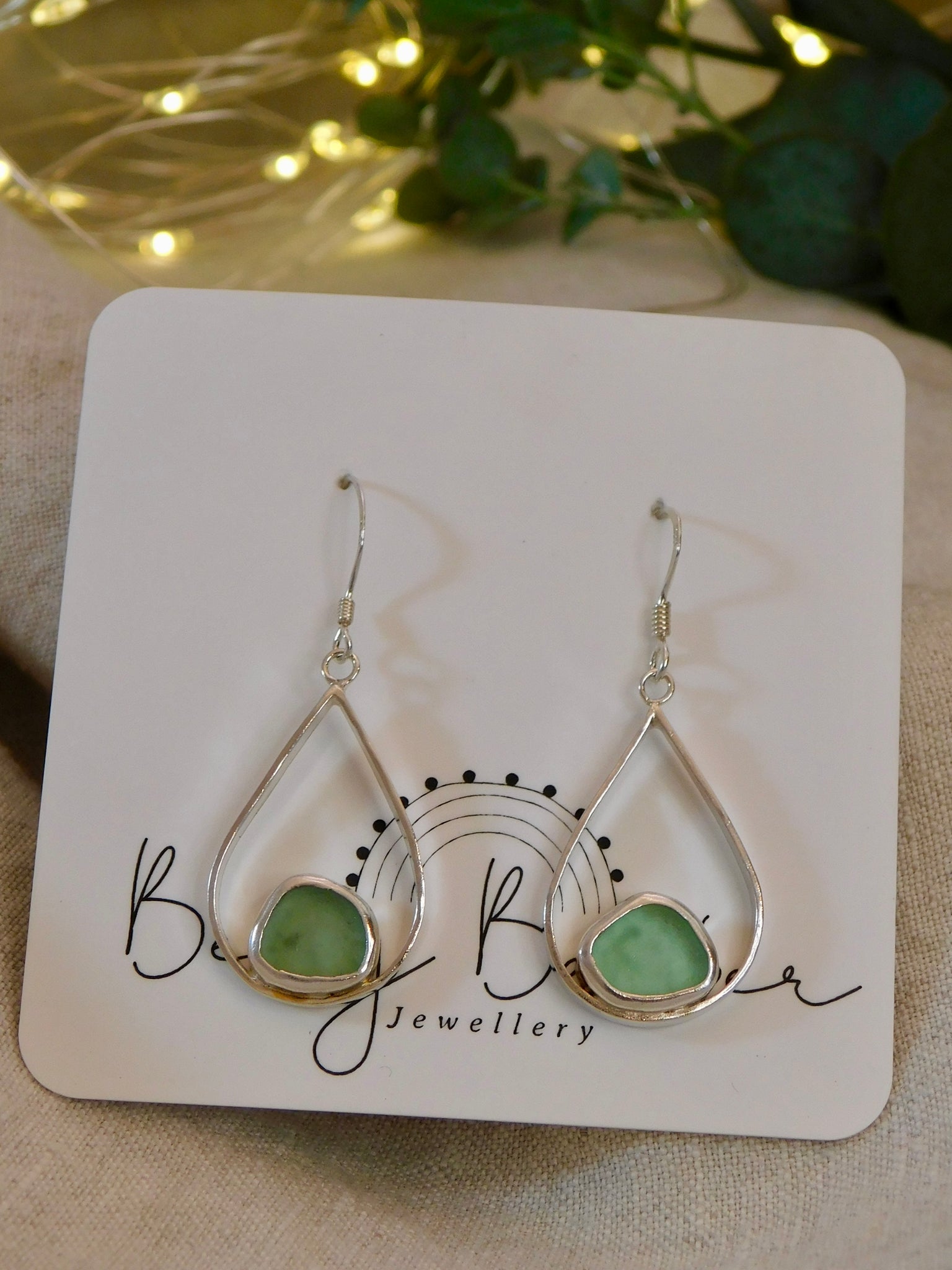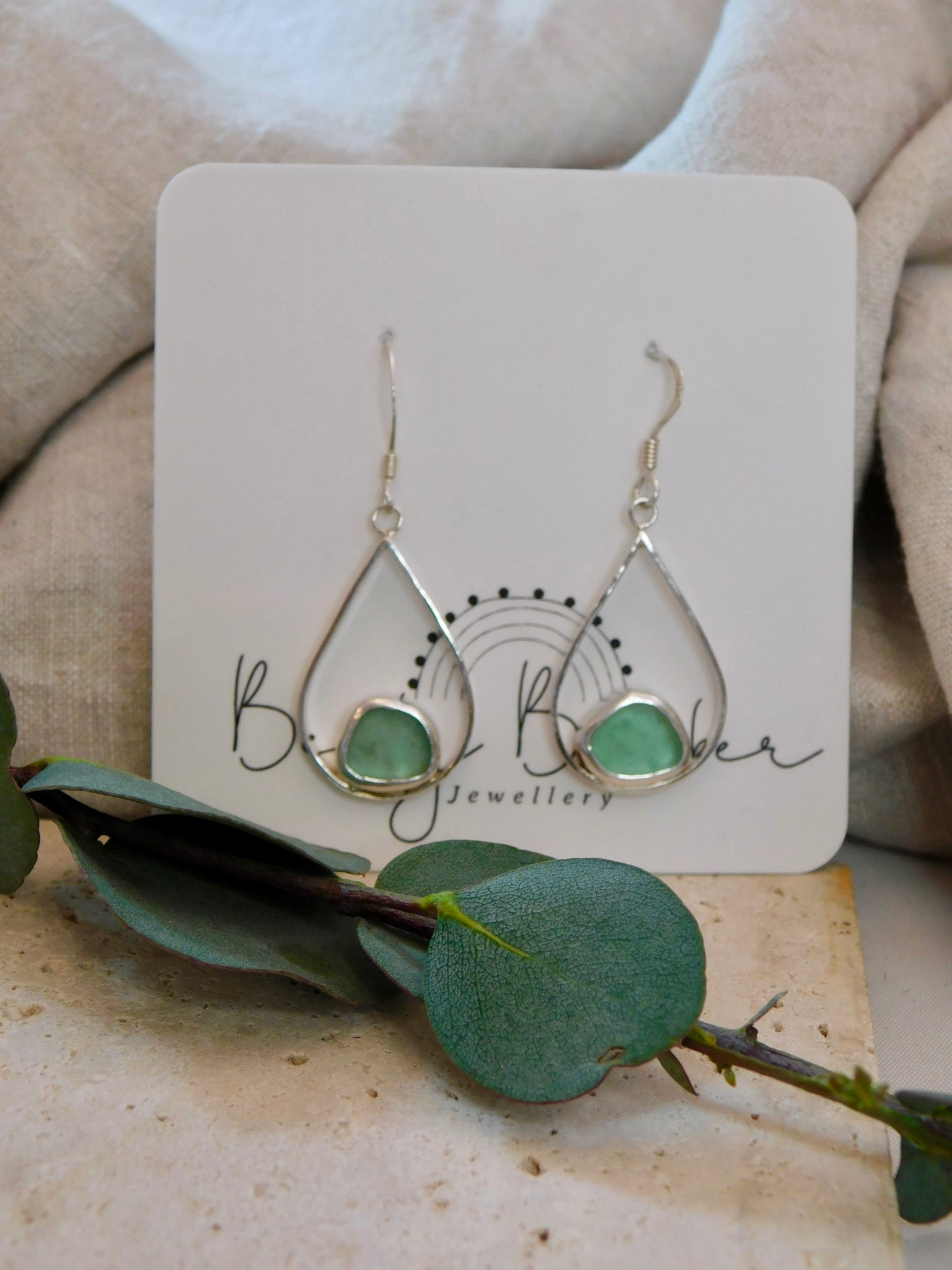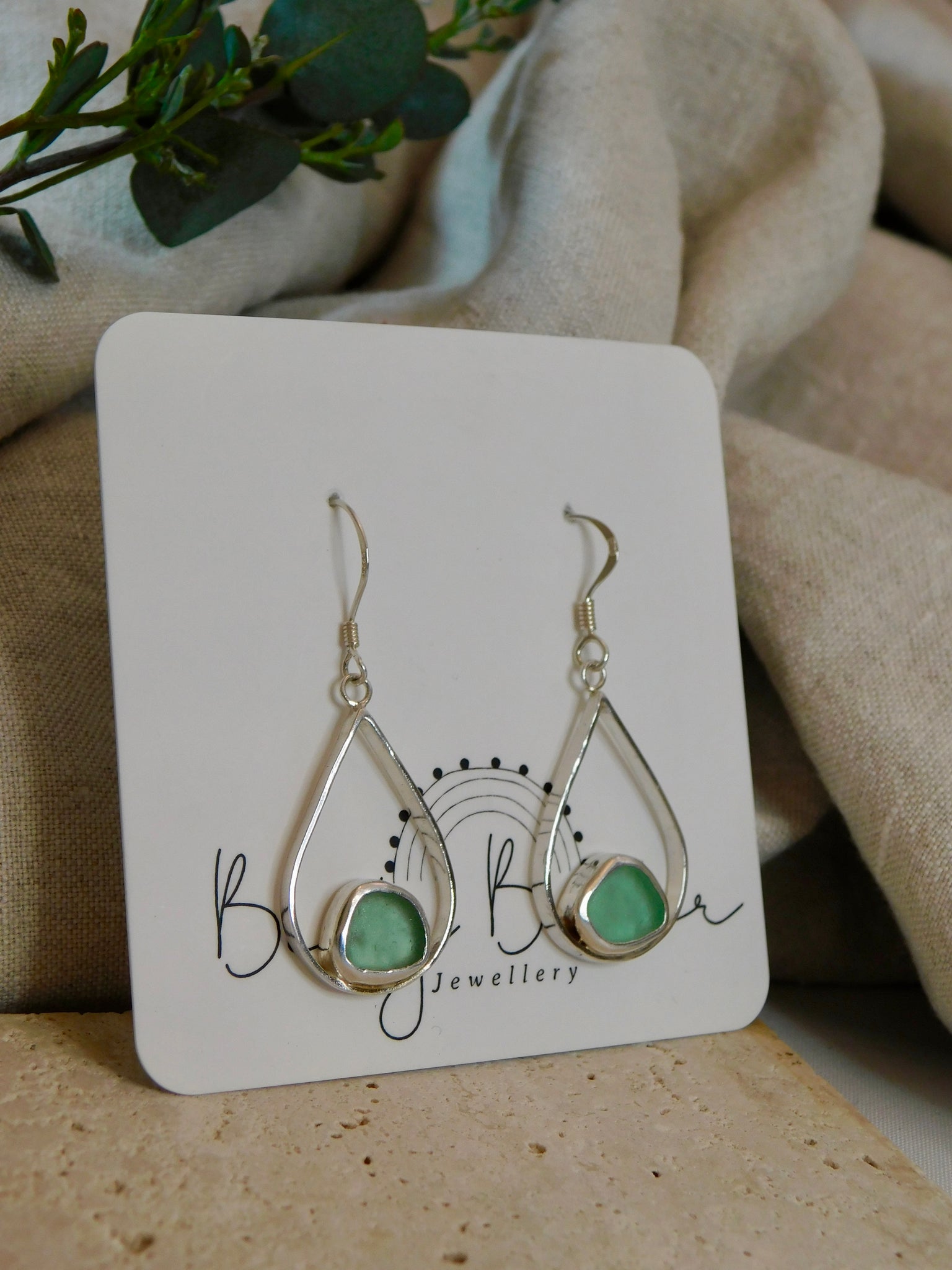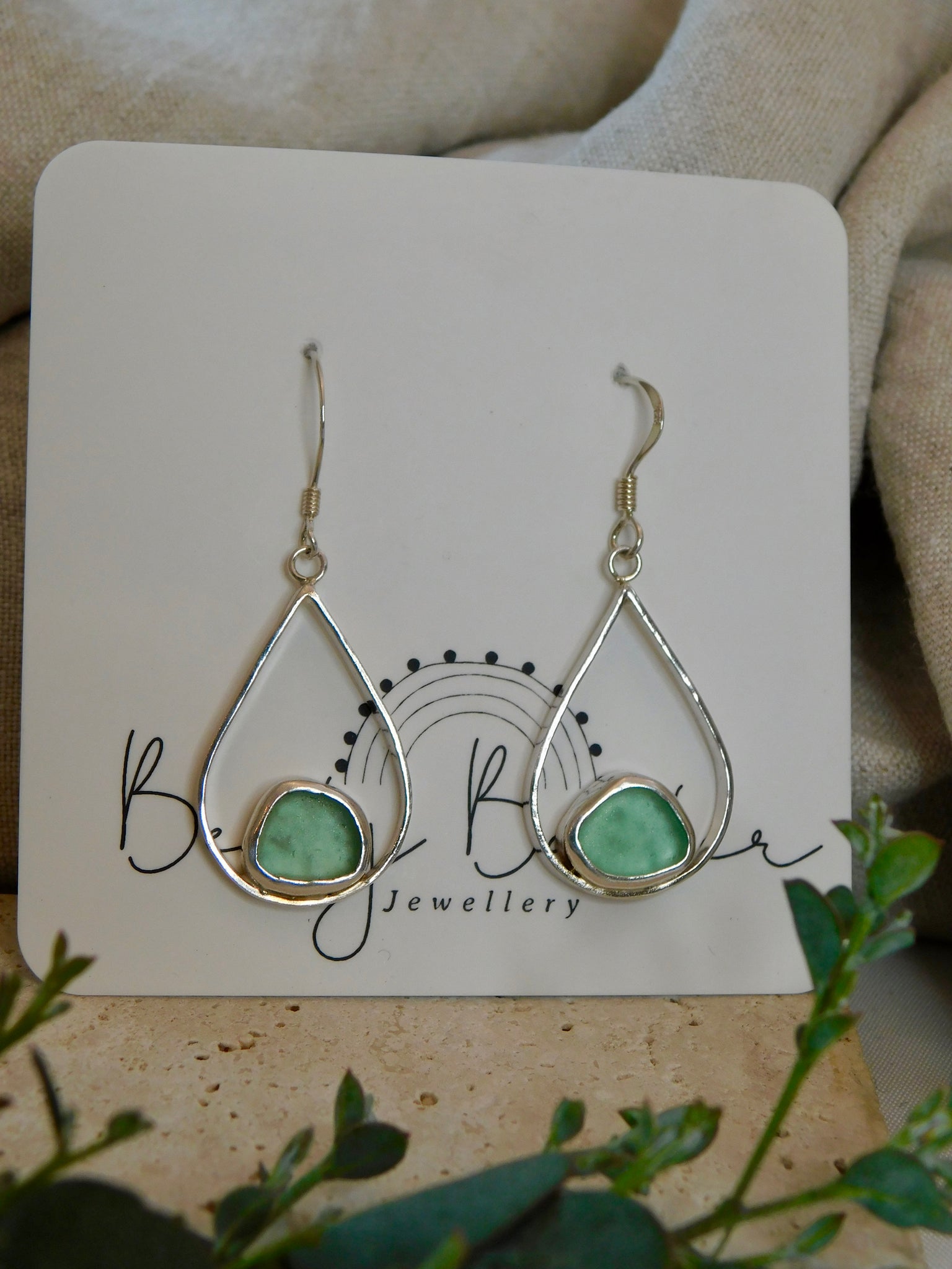 Aqua Sea Glass Pear Shaped Sterling Silver Dangles