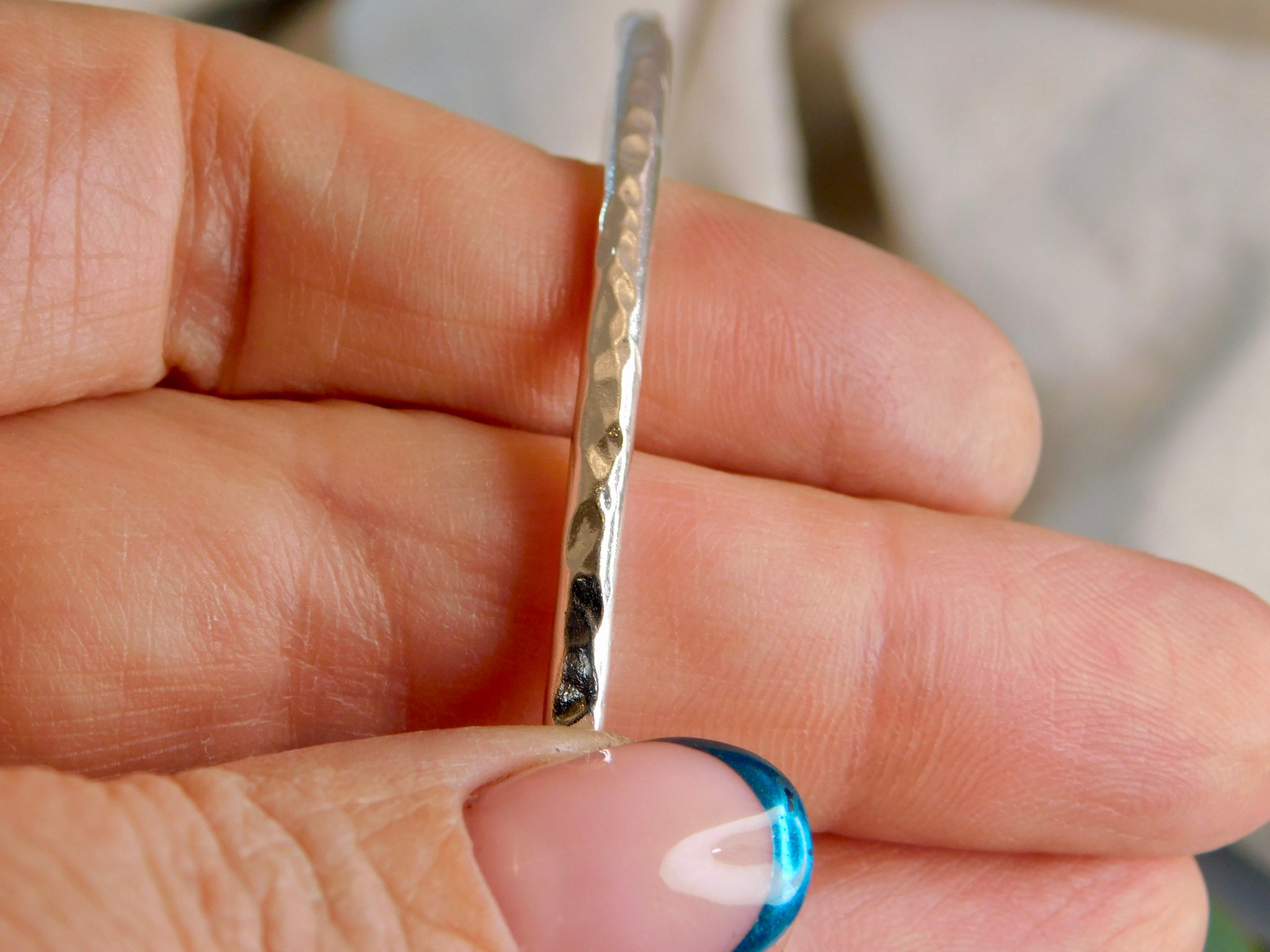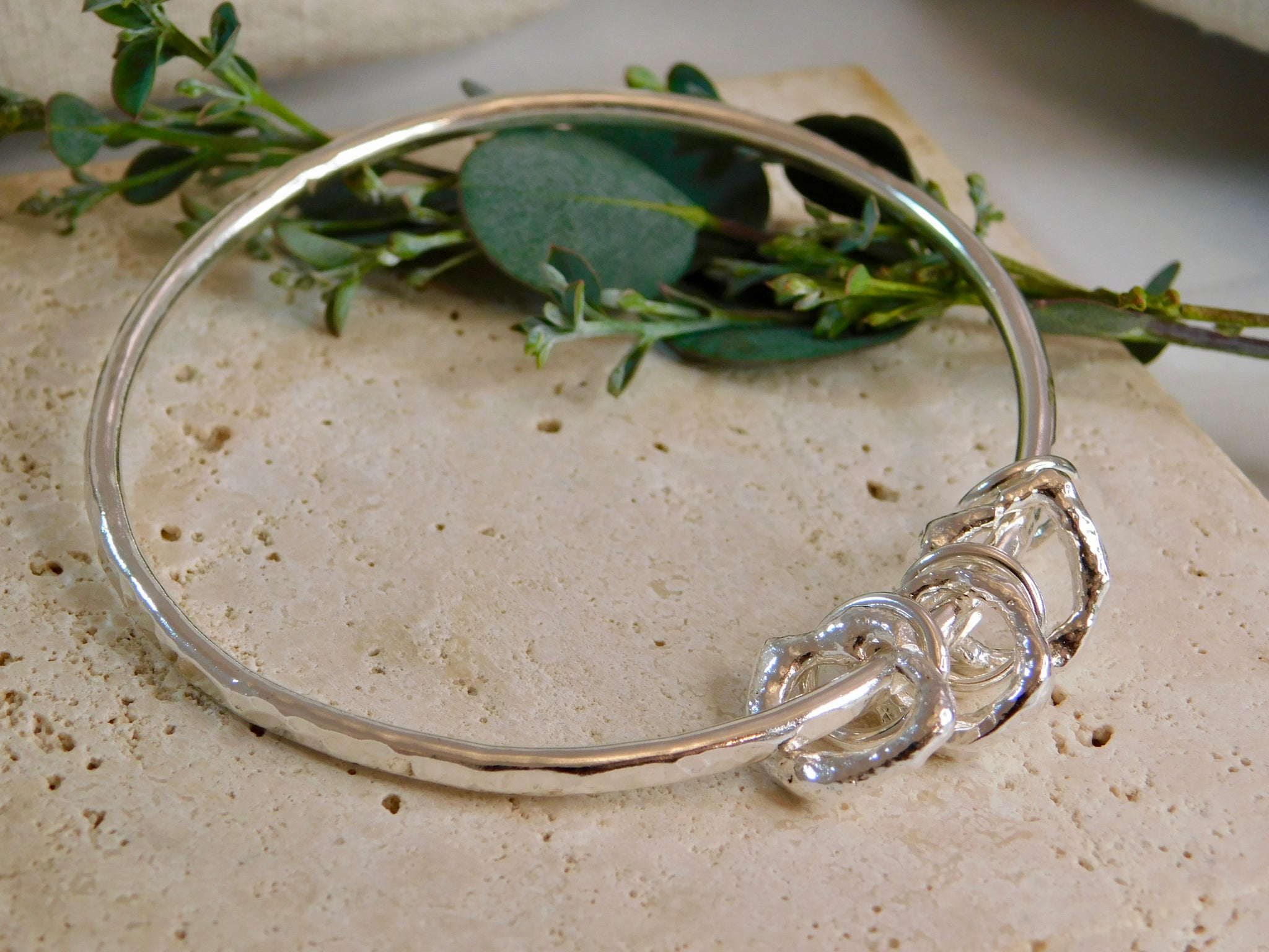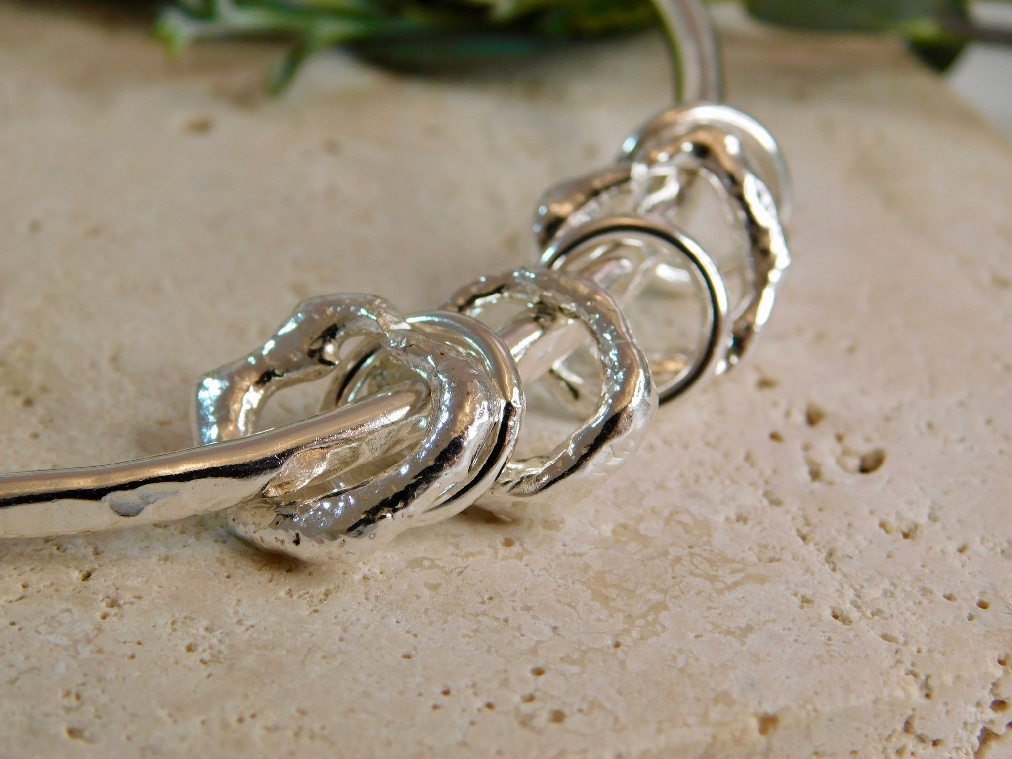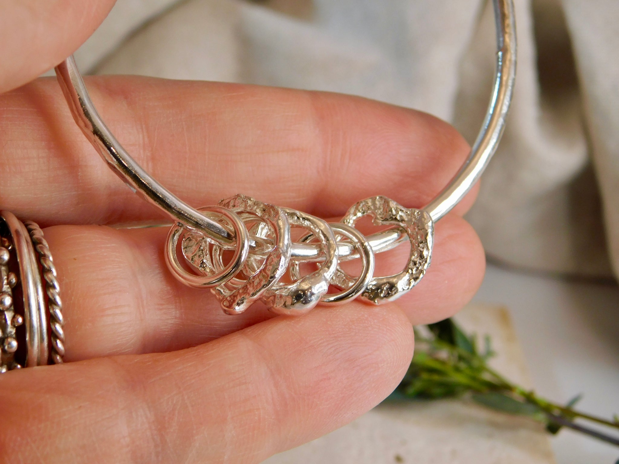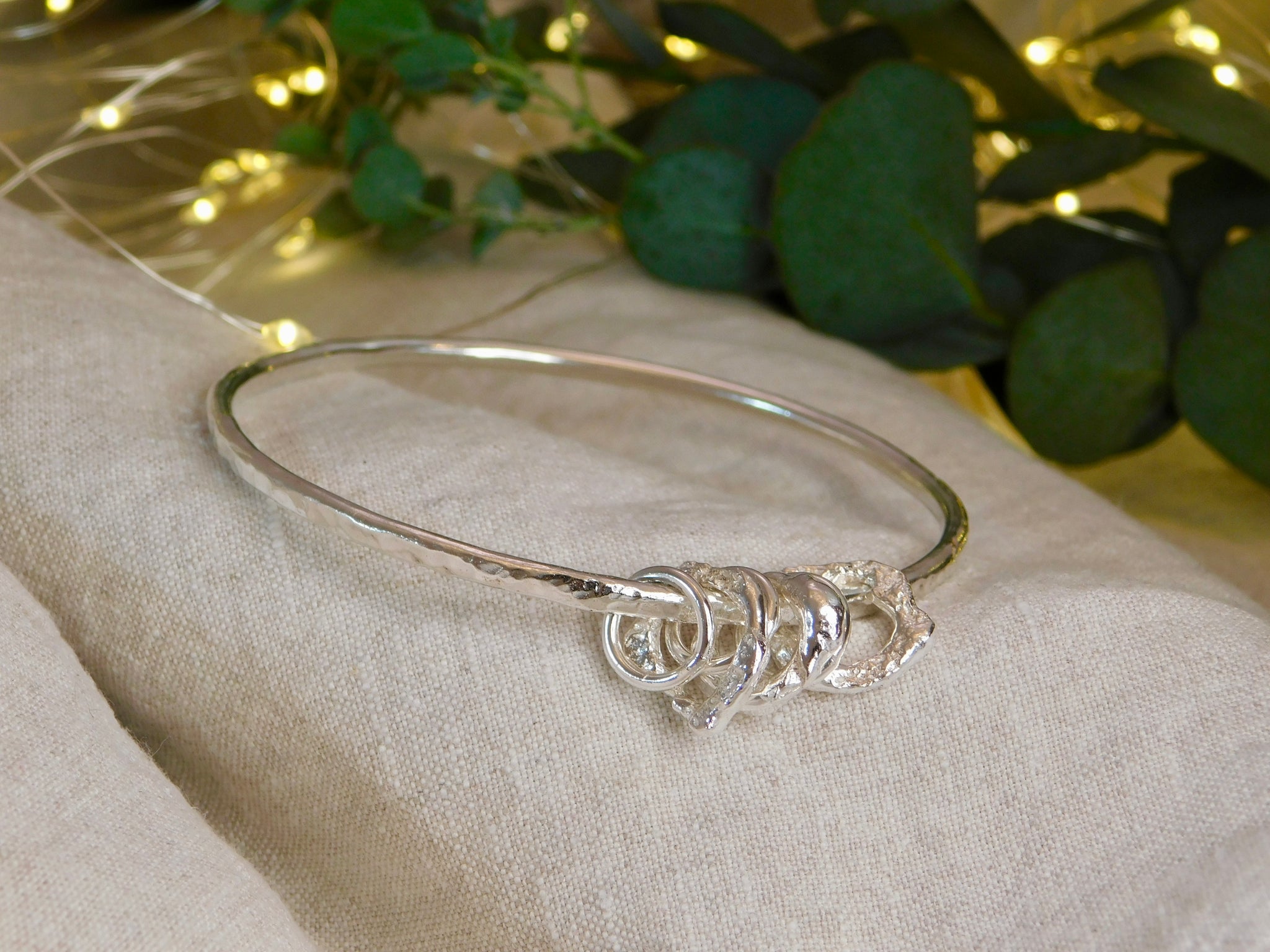 This bangle has a hammered texture and super shiny. And has 6 sterling silver hoops hanging from it - 3 made from smooth wire and 3 molten hoops which are organically shaped and highly textured - It’s a real piece to treasure I think.