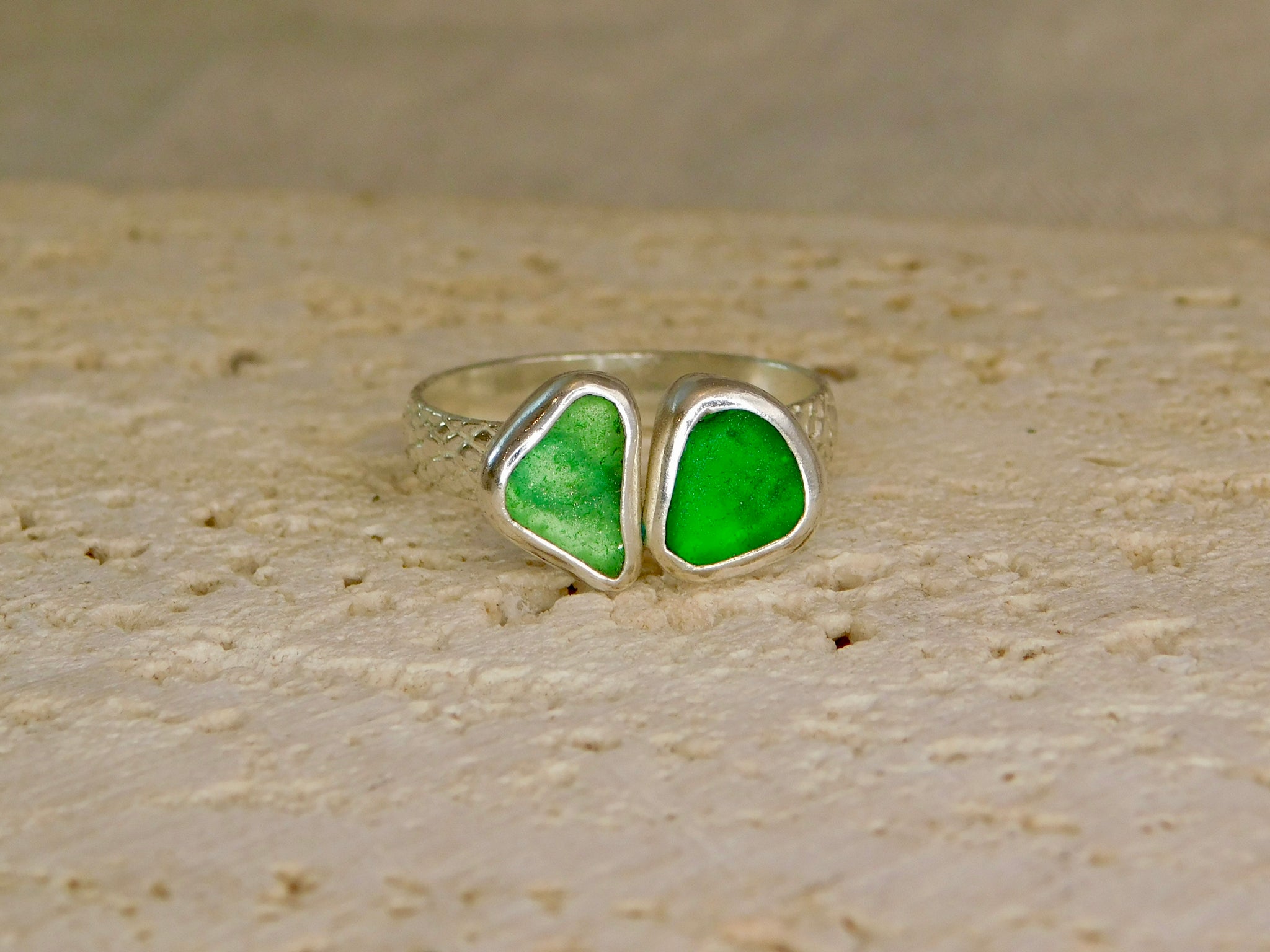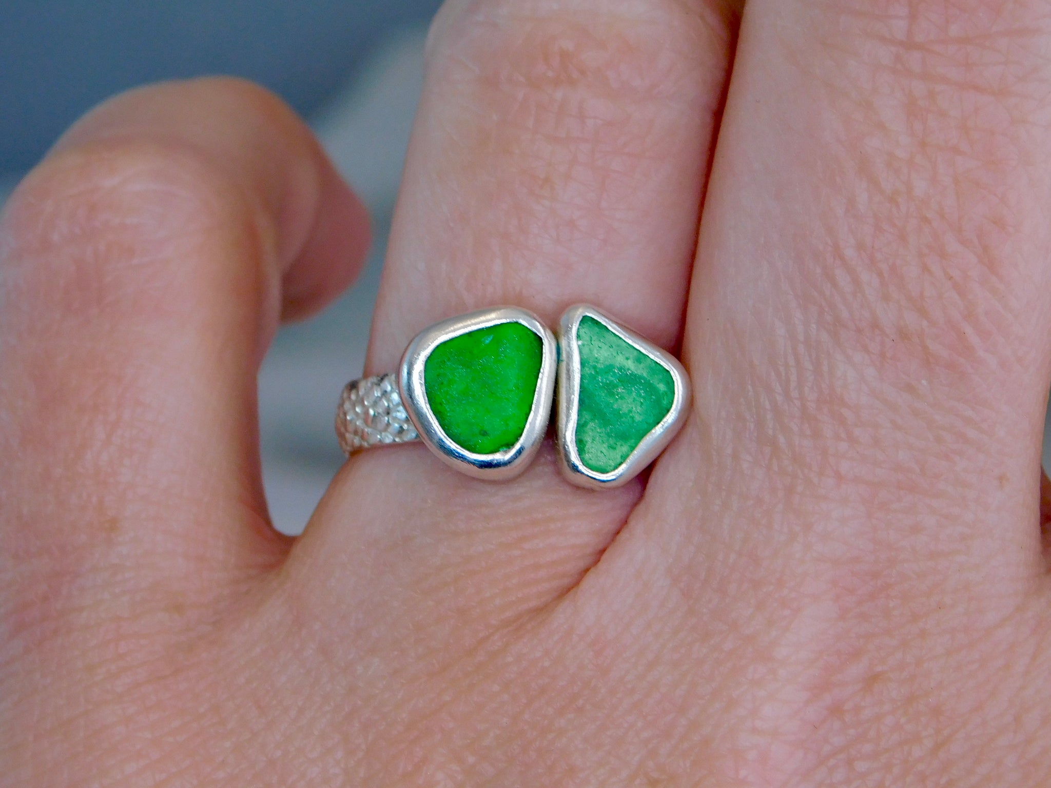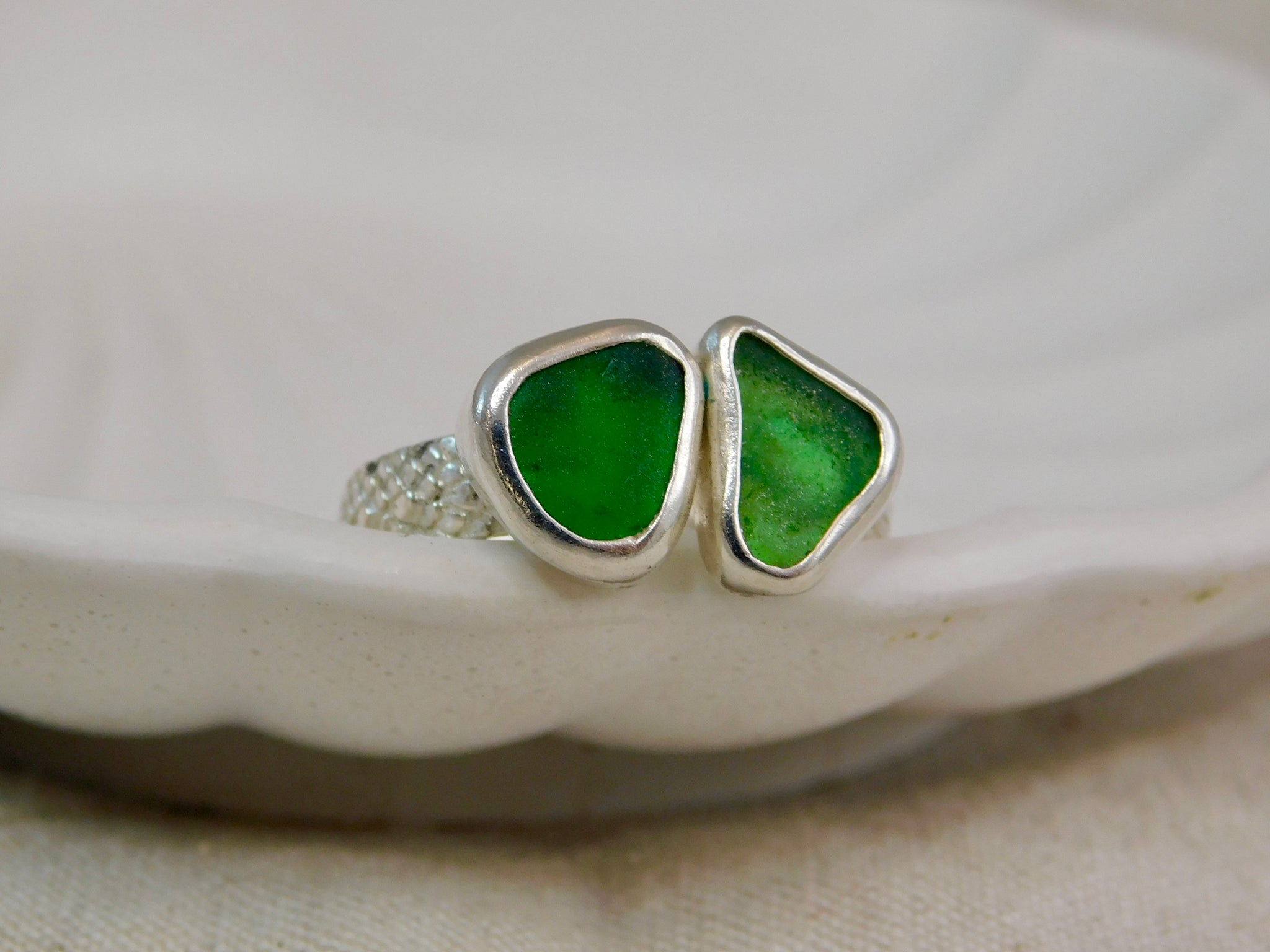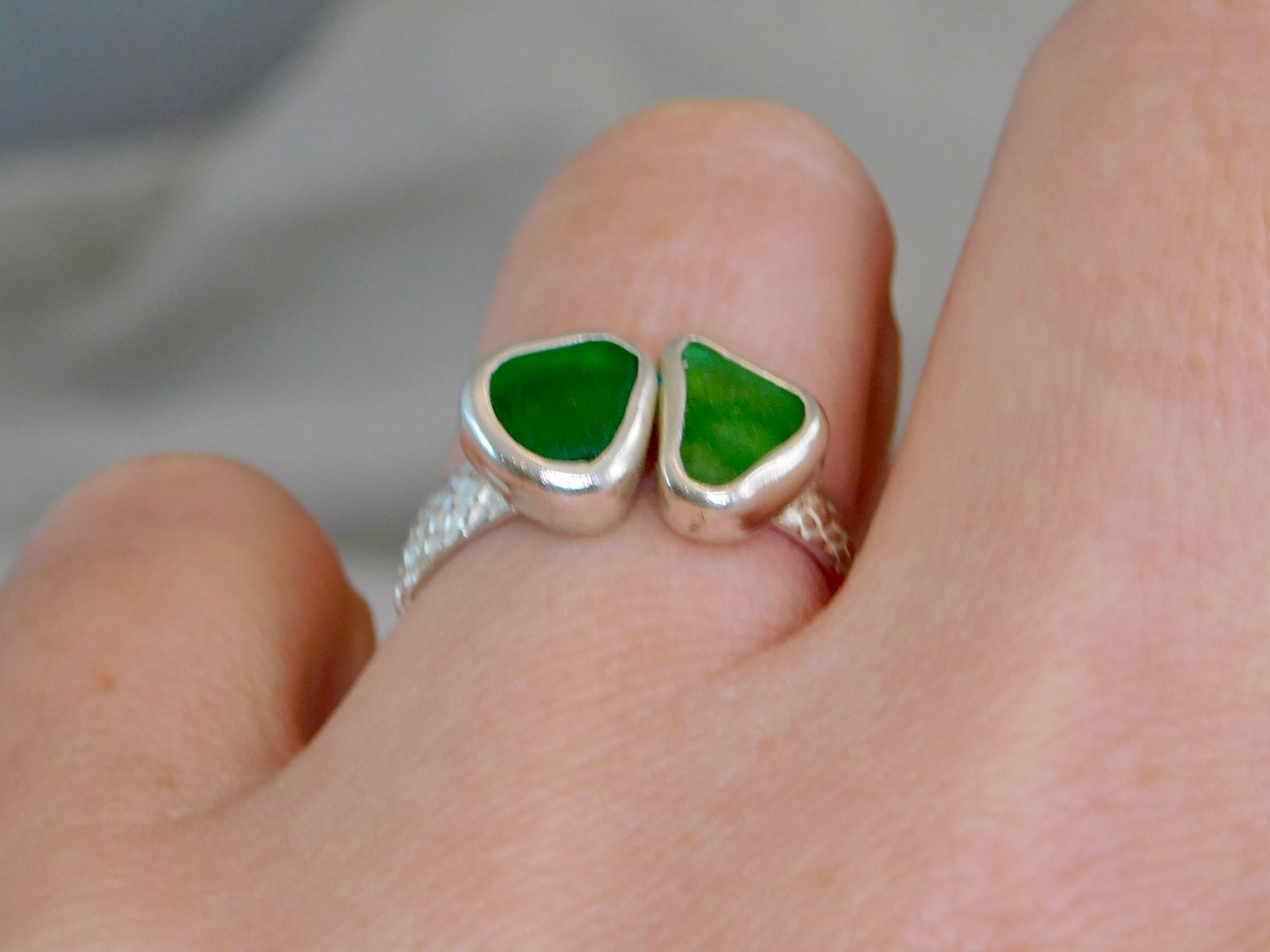 This lovely ring consists of two pieces of sea glass, in beautiful greeb shades, making a statement ring.