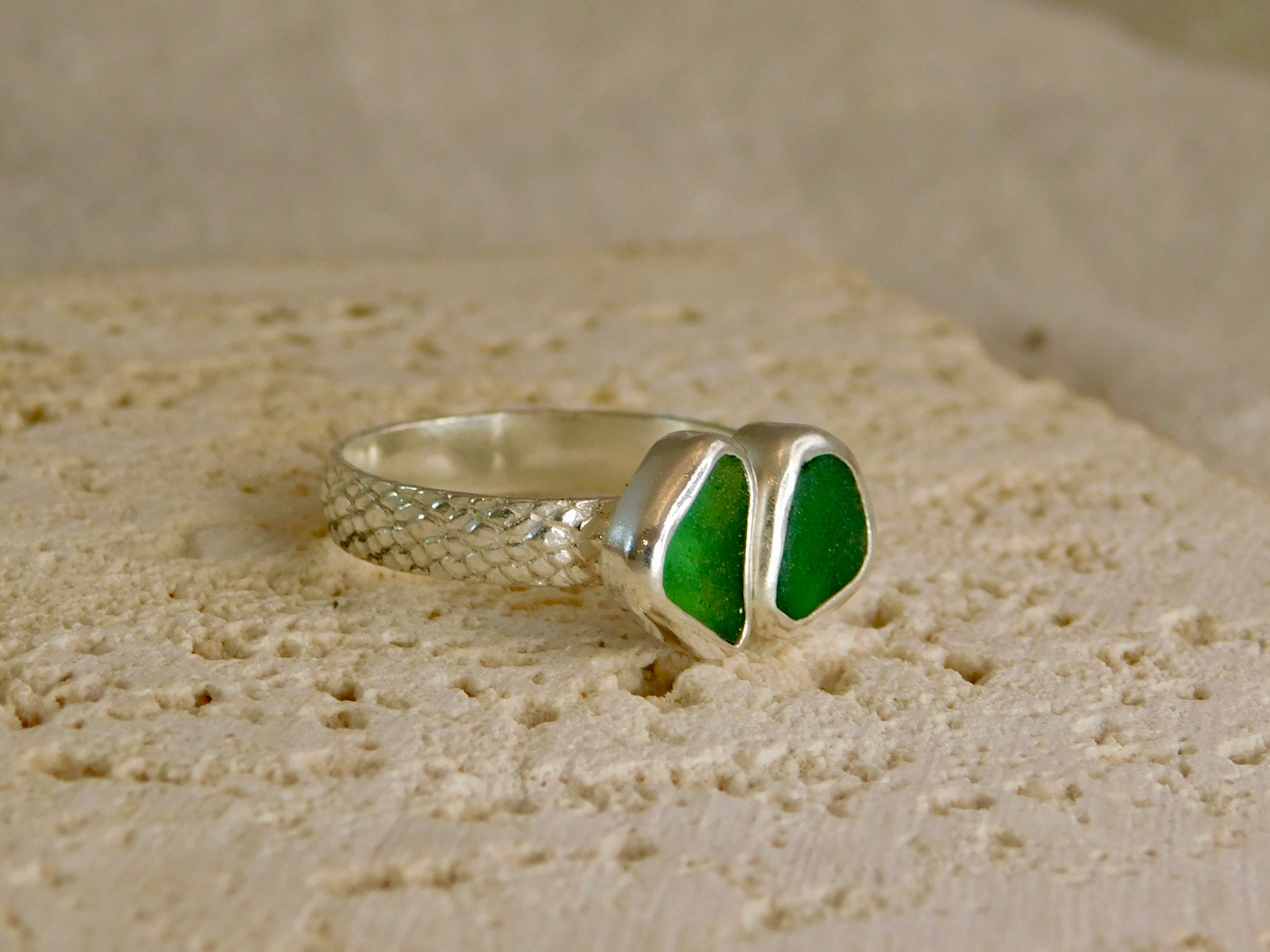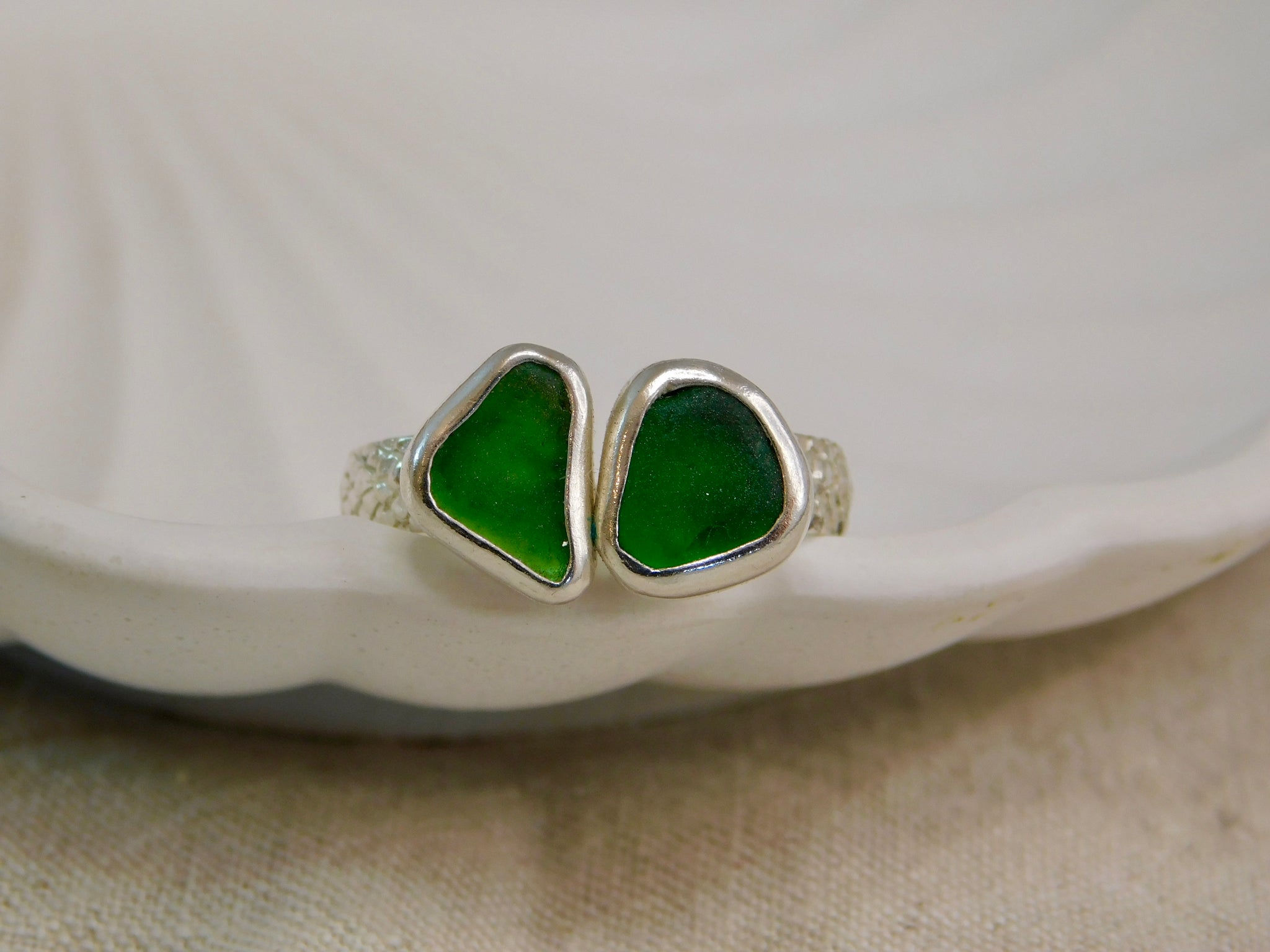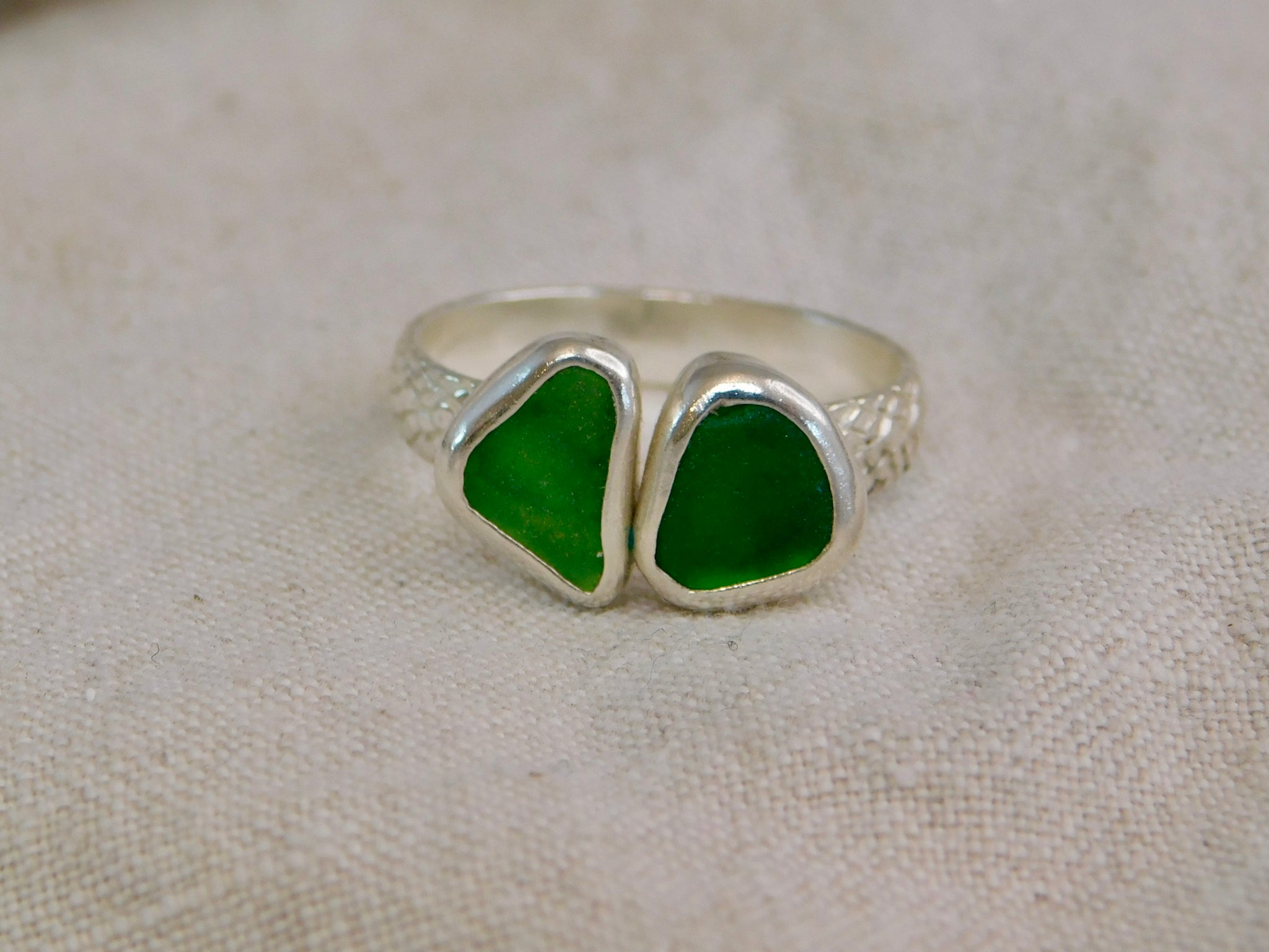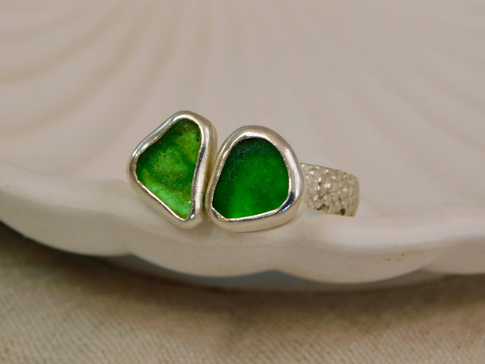 This lovely ring consists of two pieces of sea glass, in beautiful greeb shades, making a statement ring.