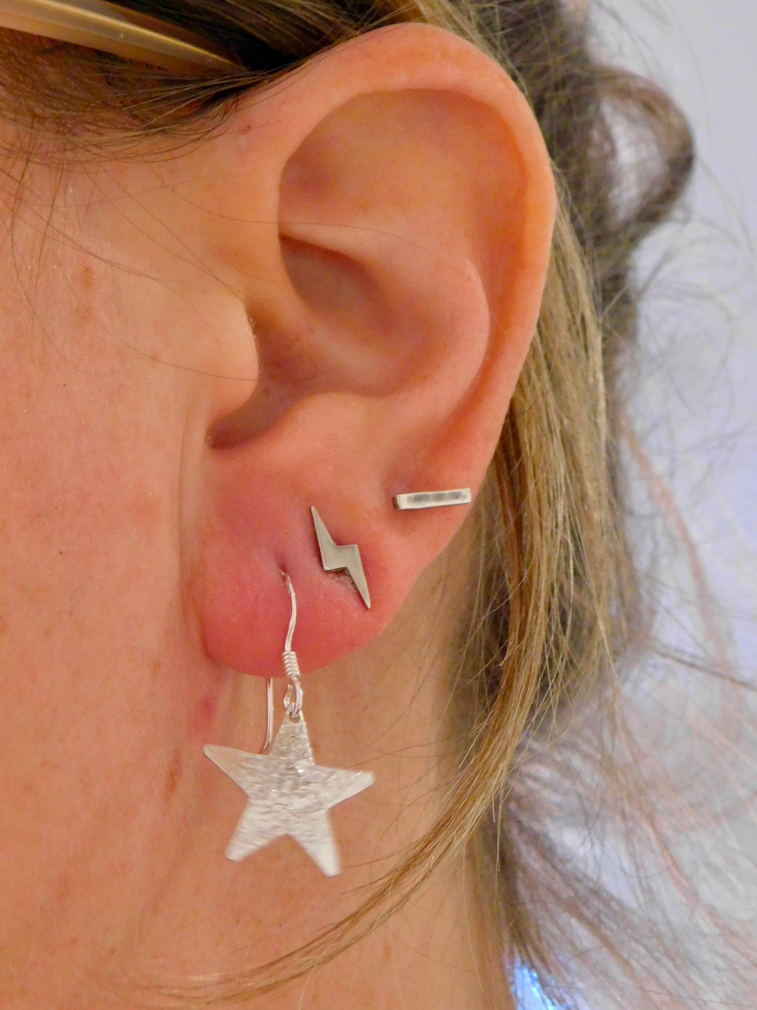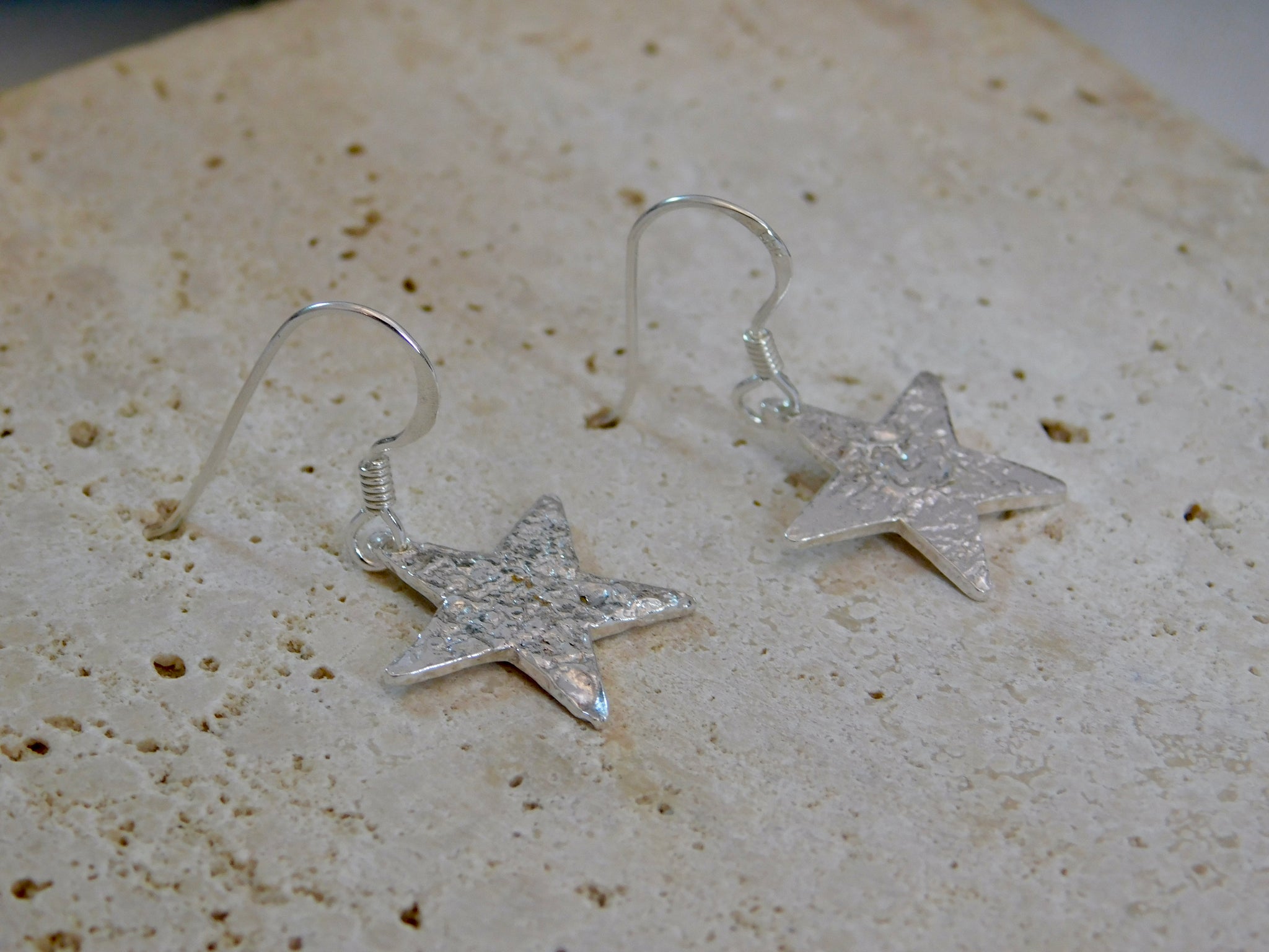 These lovely earrings are simple and festive. A large, reticulated hand cut Silver Star dangles from a simple Sterling Silver hook.