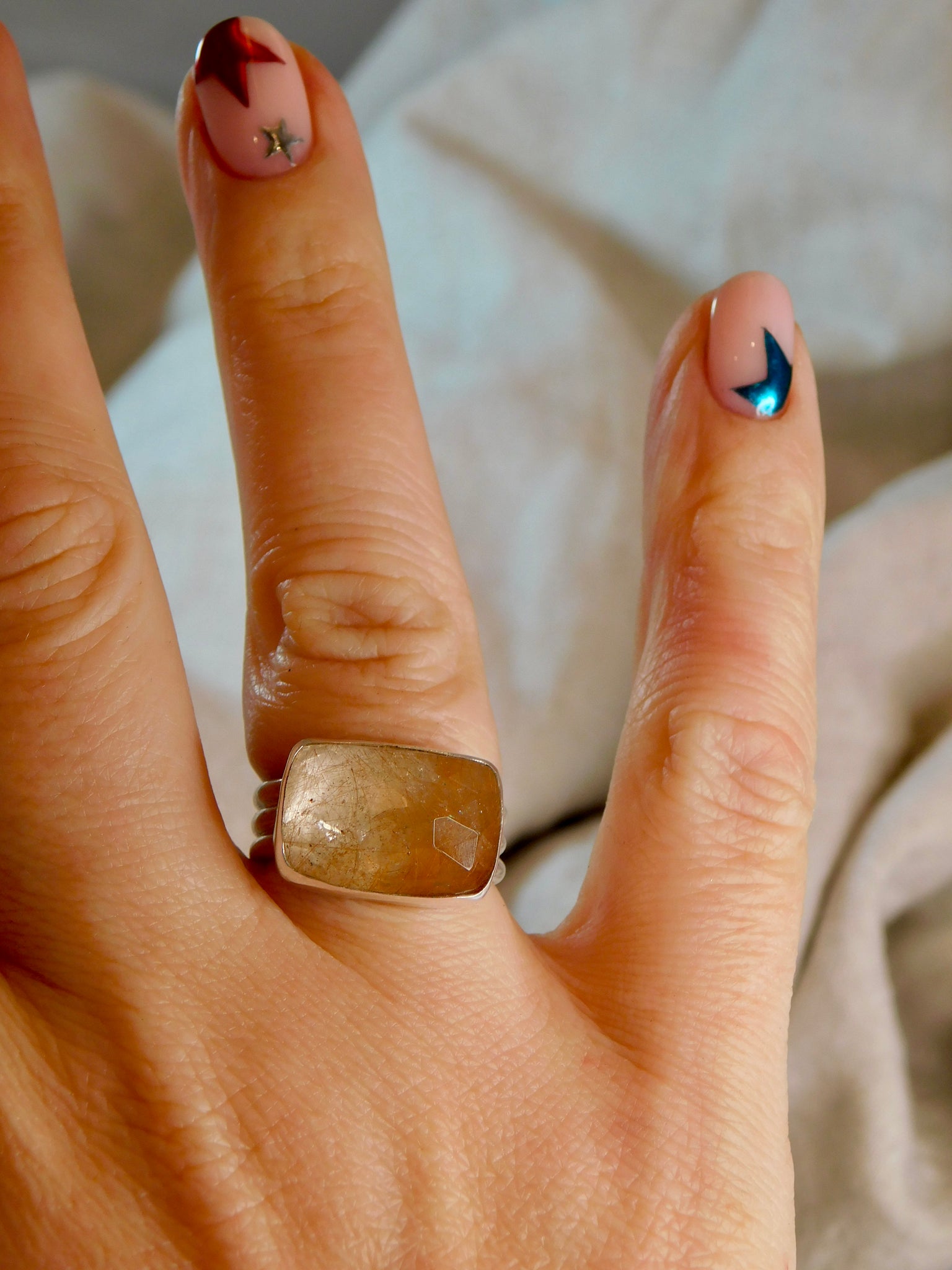 I have set this beautiful stone on a wide, triple sterling silver  ring band. It’s chunky and shiny and simply gorgeous!