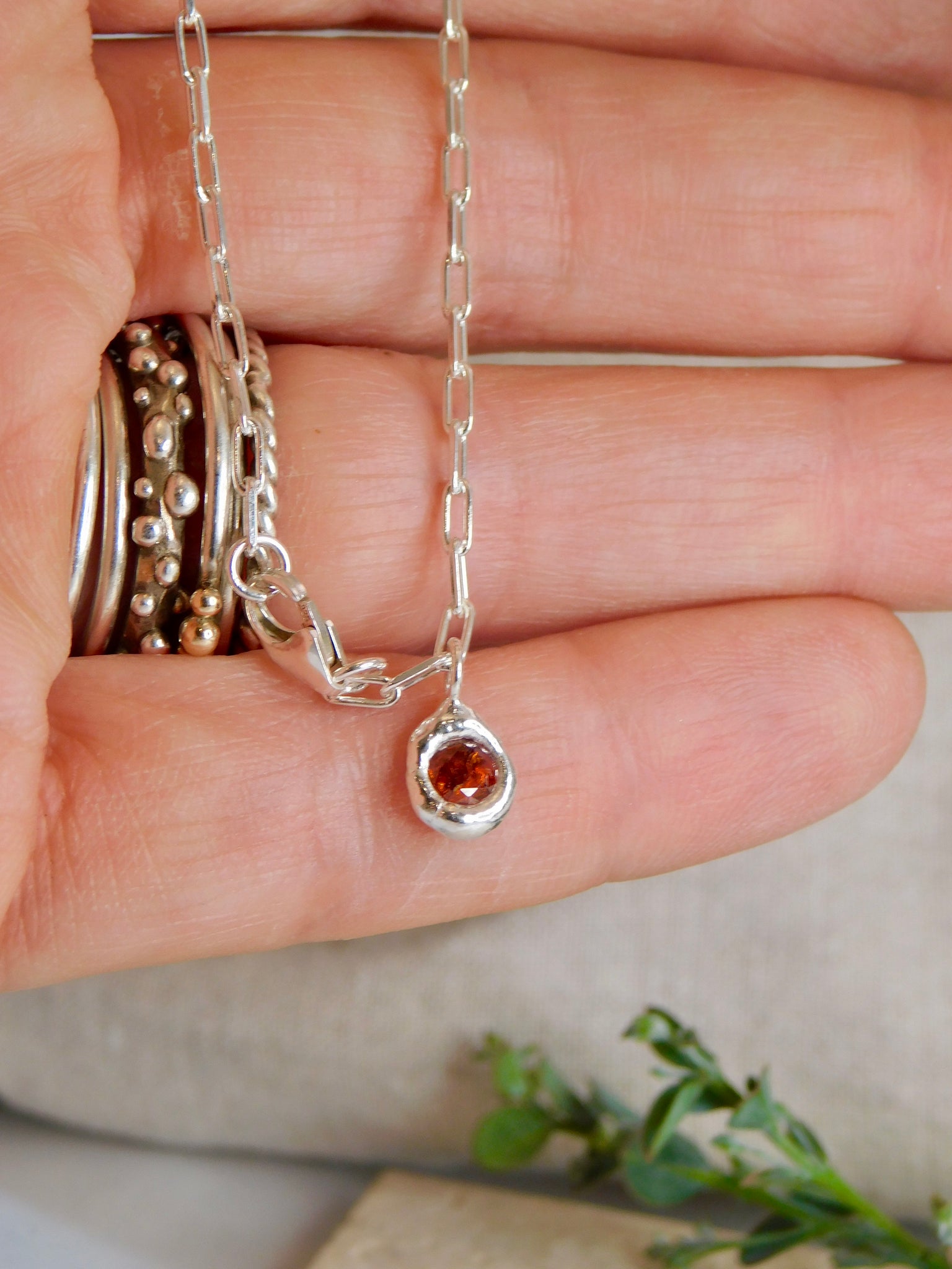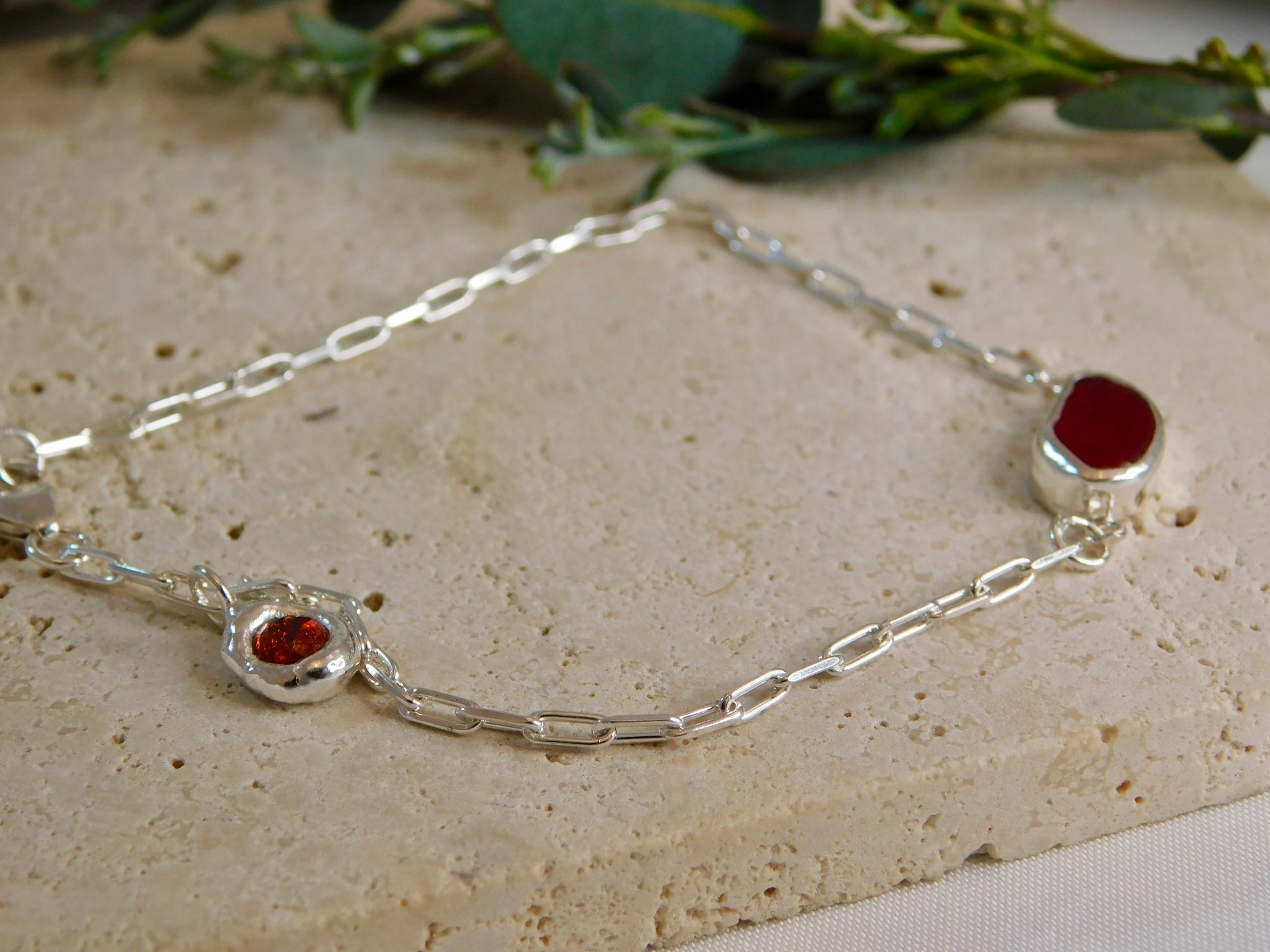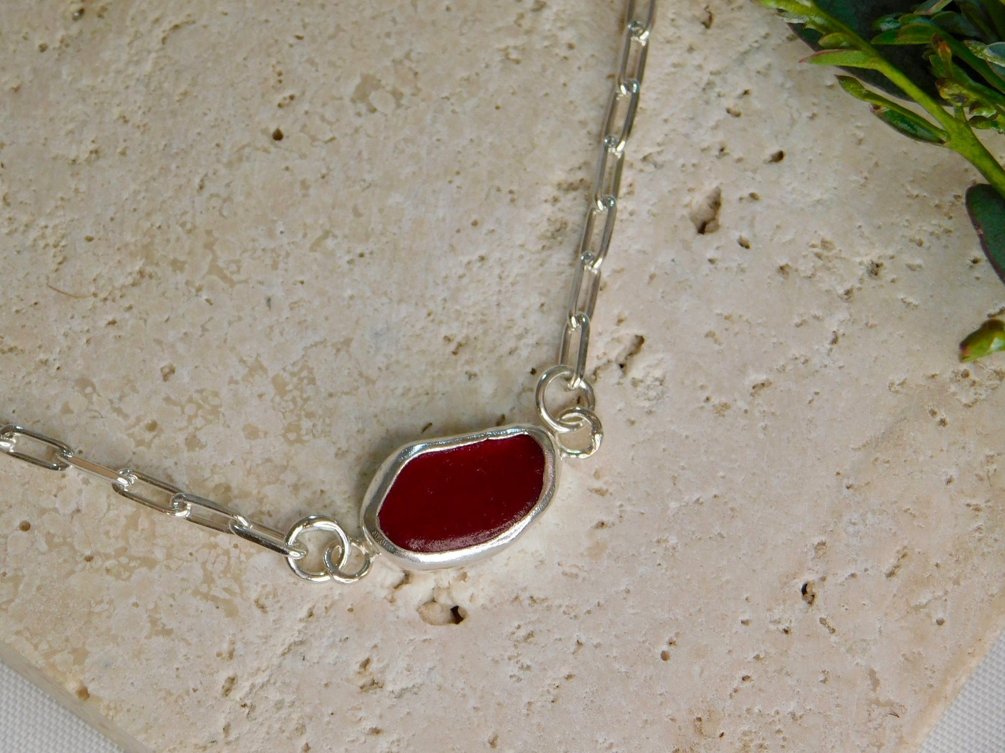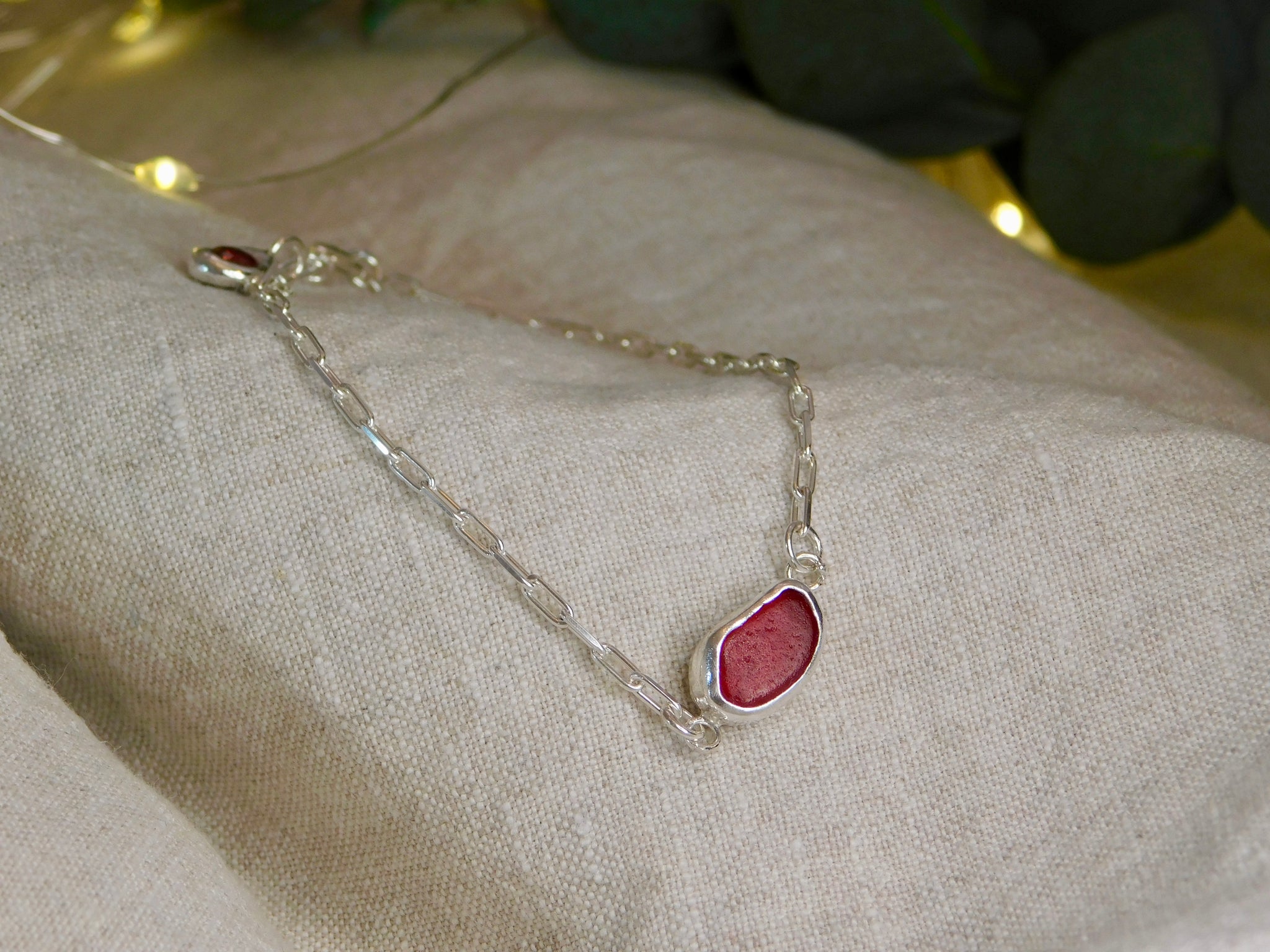 Made using fine sterling silver paperclip chain, this lovely delicate bracelet is perfect for everyday wear. It has a piece of dark red sea glass in the center. And then a little red raw sapphire sterling silver pebble charm dangling off the clasp, to help gravity keep the central charm stay on the top of your wrist.