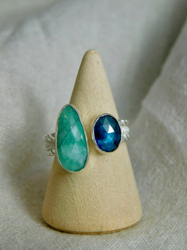 Aqua Sea Glass and Rainbow Moonstone Triple Sterling Silver Ring