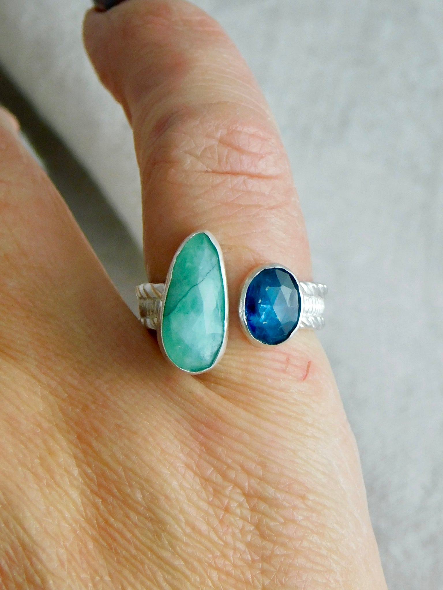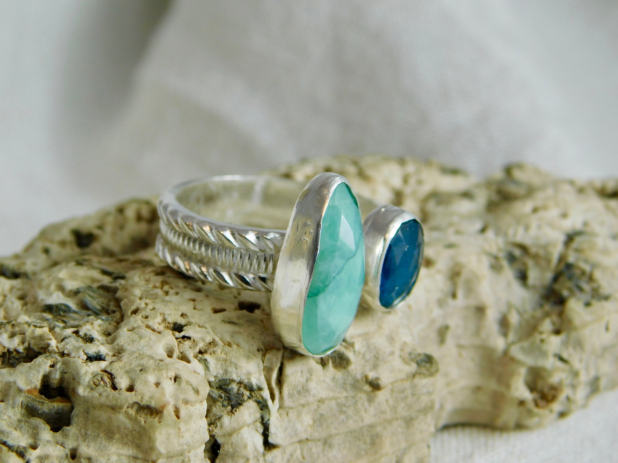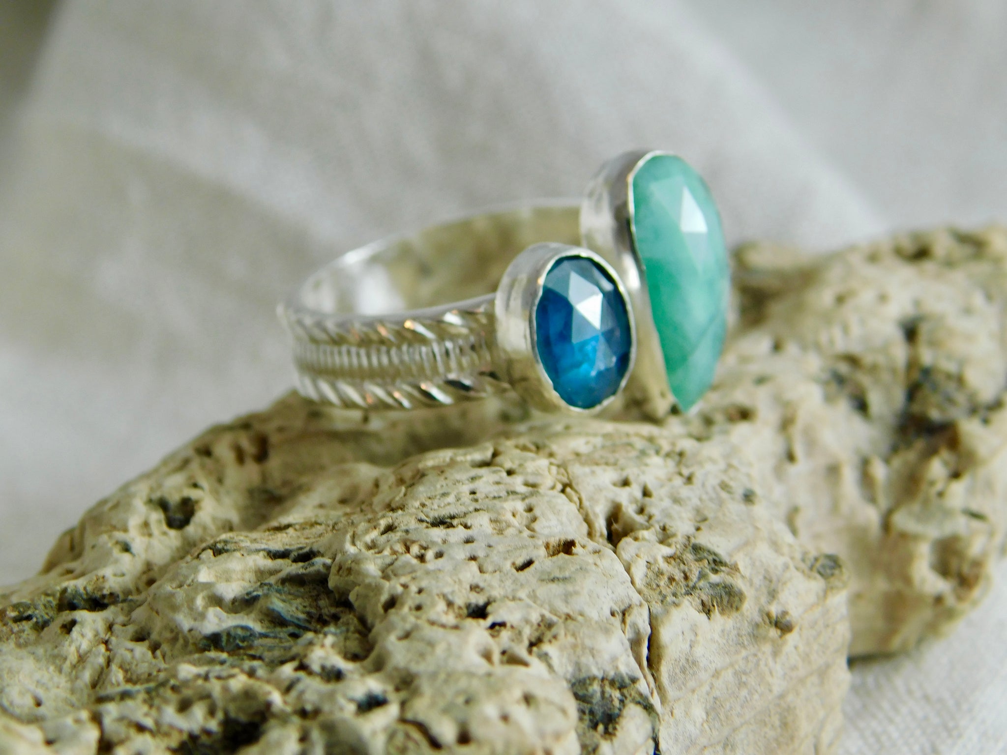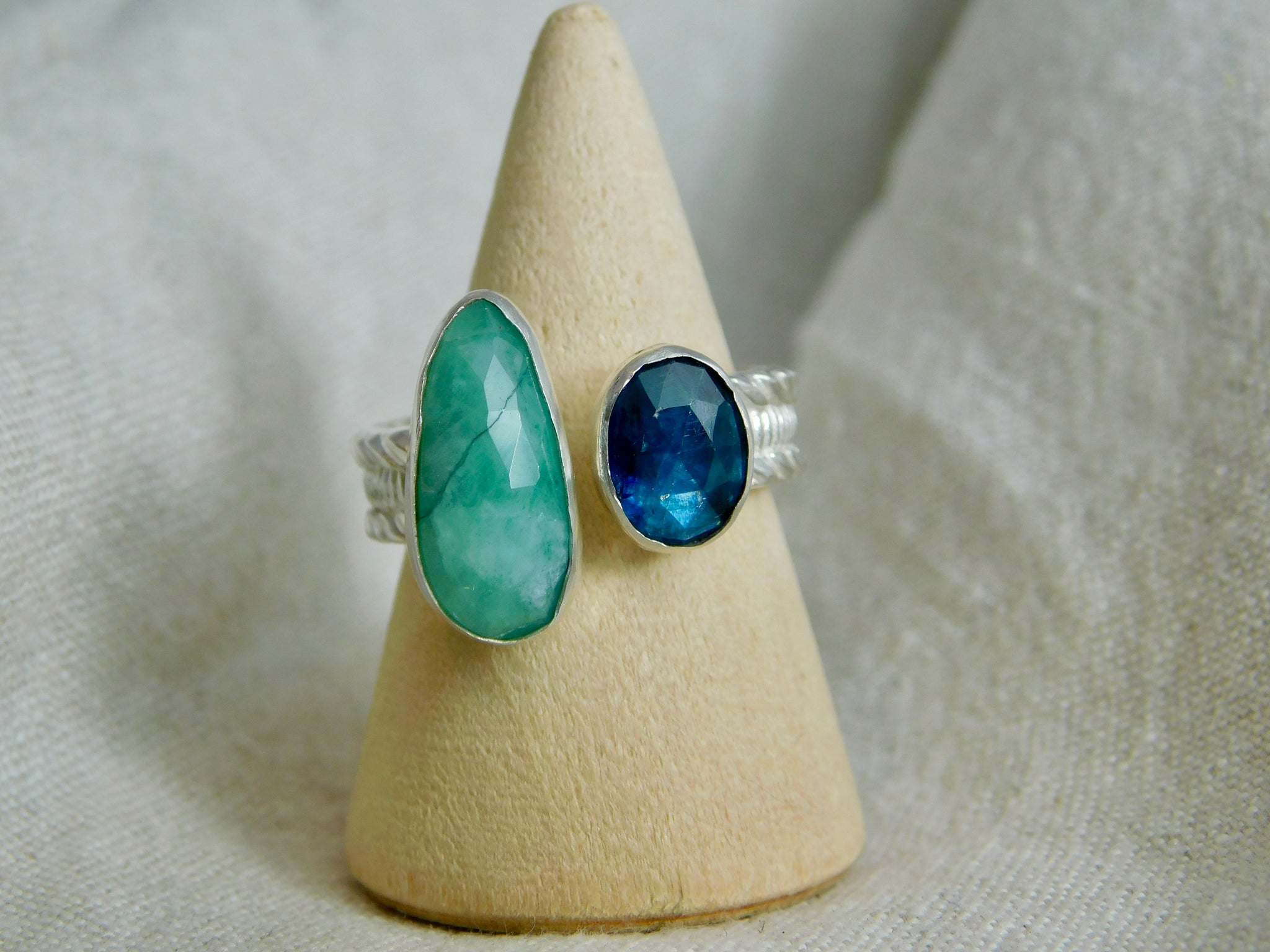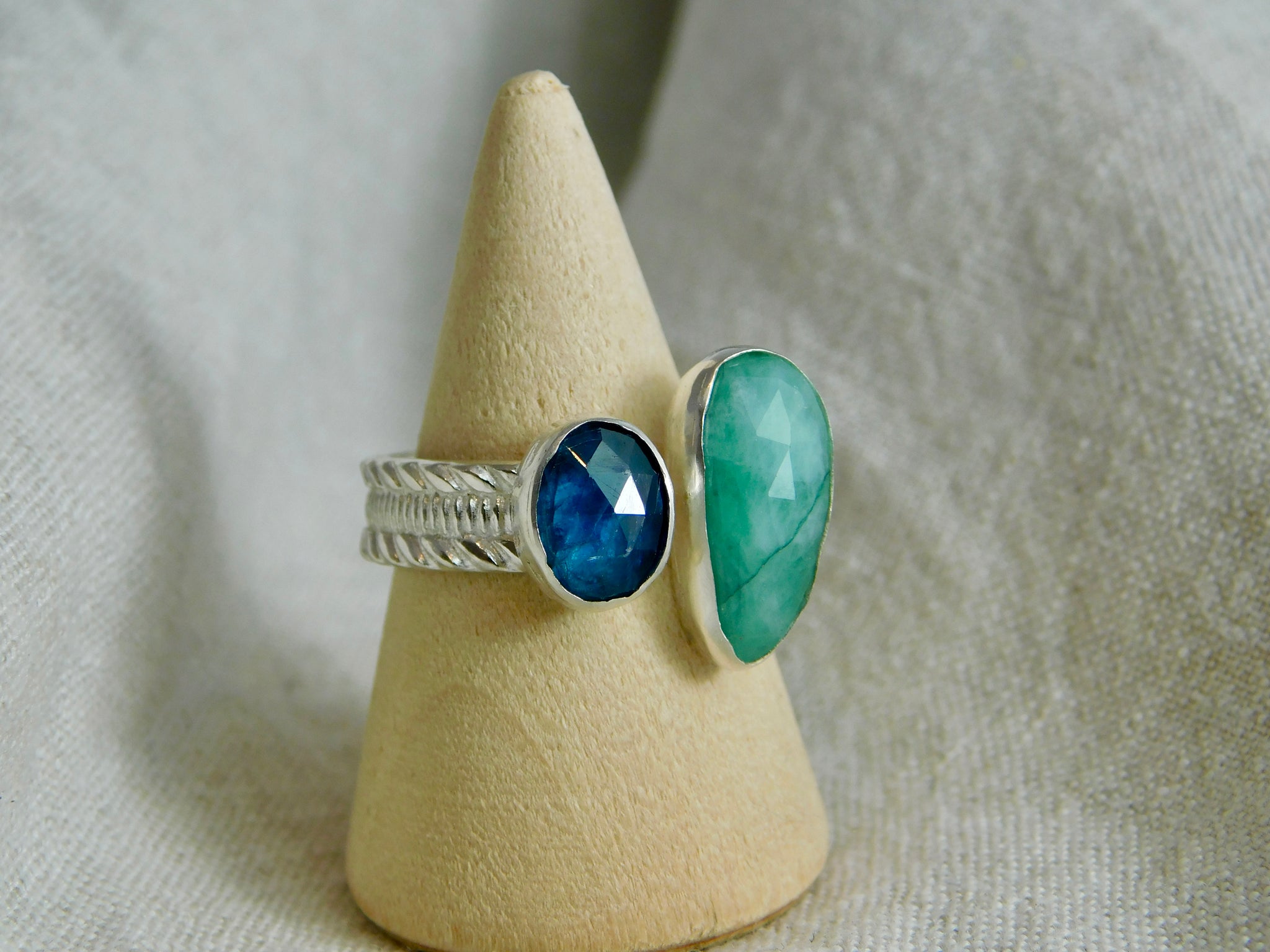 This lovely ring comprises of a small, bright and beautiful piece of Rose Cut Aqua Kyanite and a Pastel pale green piece of rose cut Emerald, and I am so pleased with this colour combo I love.