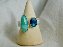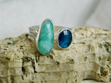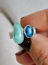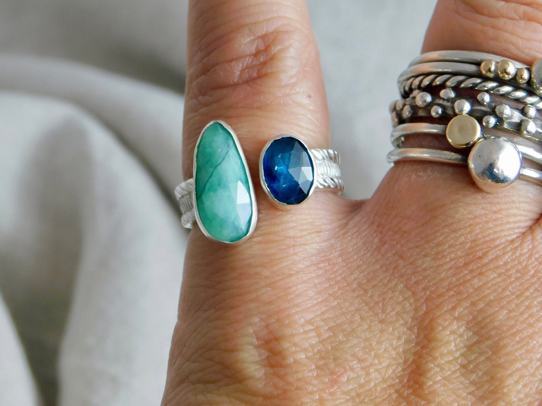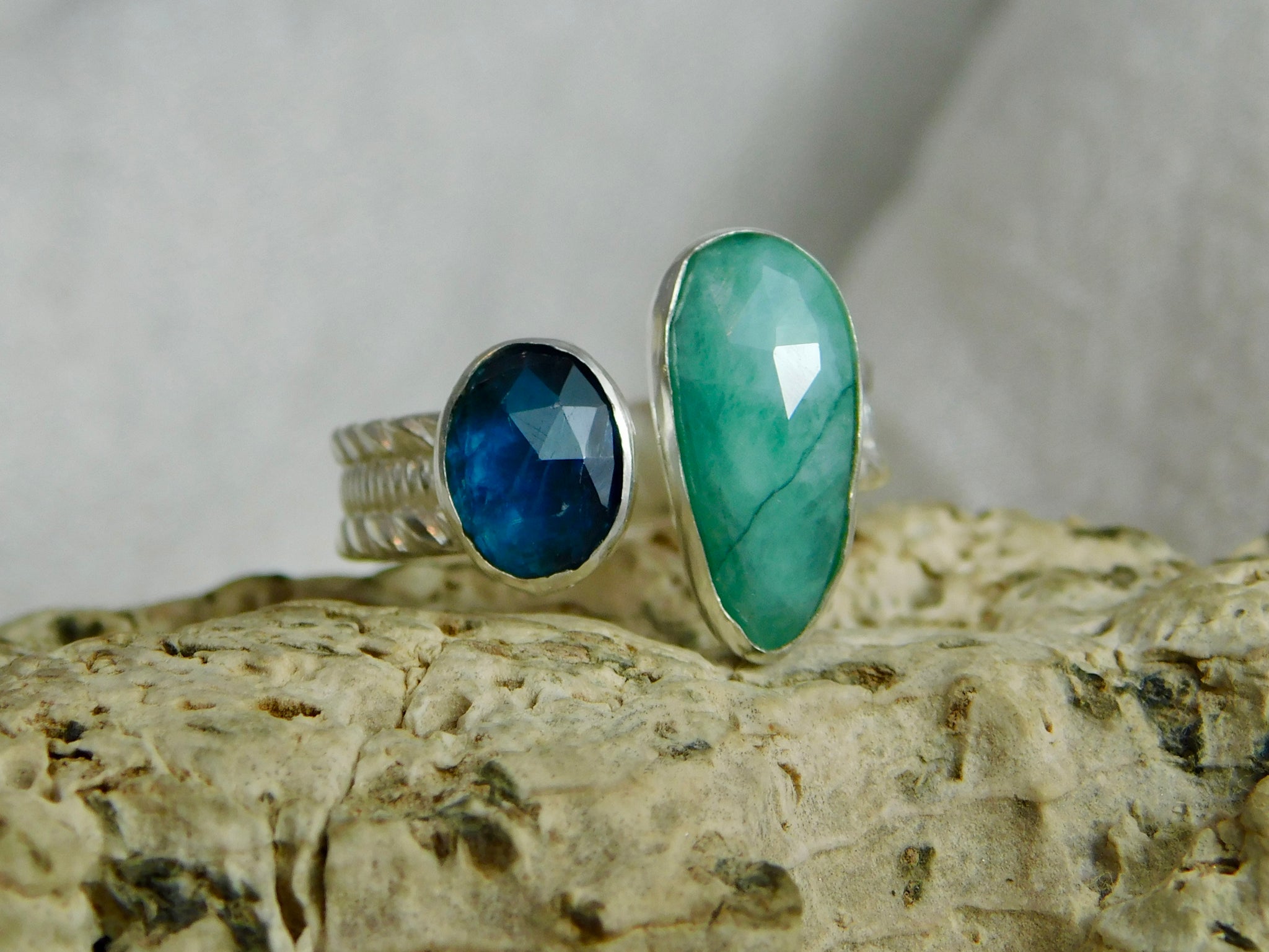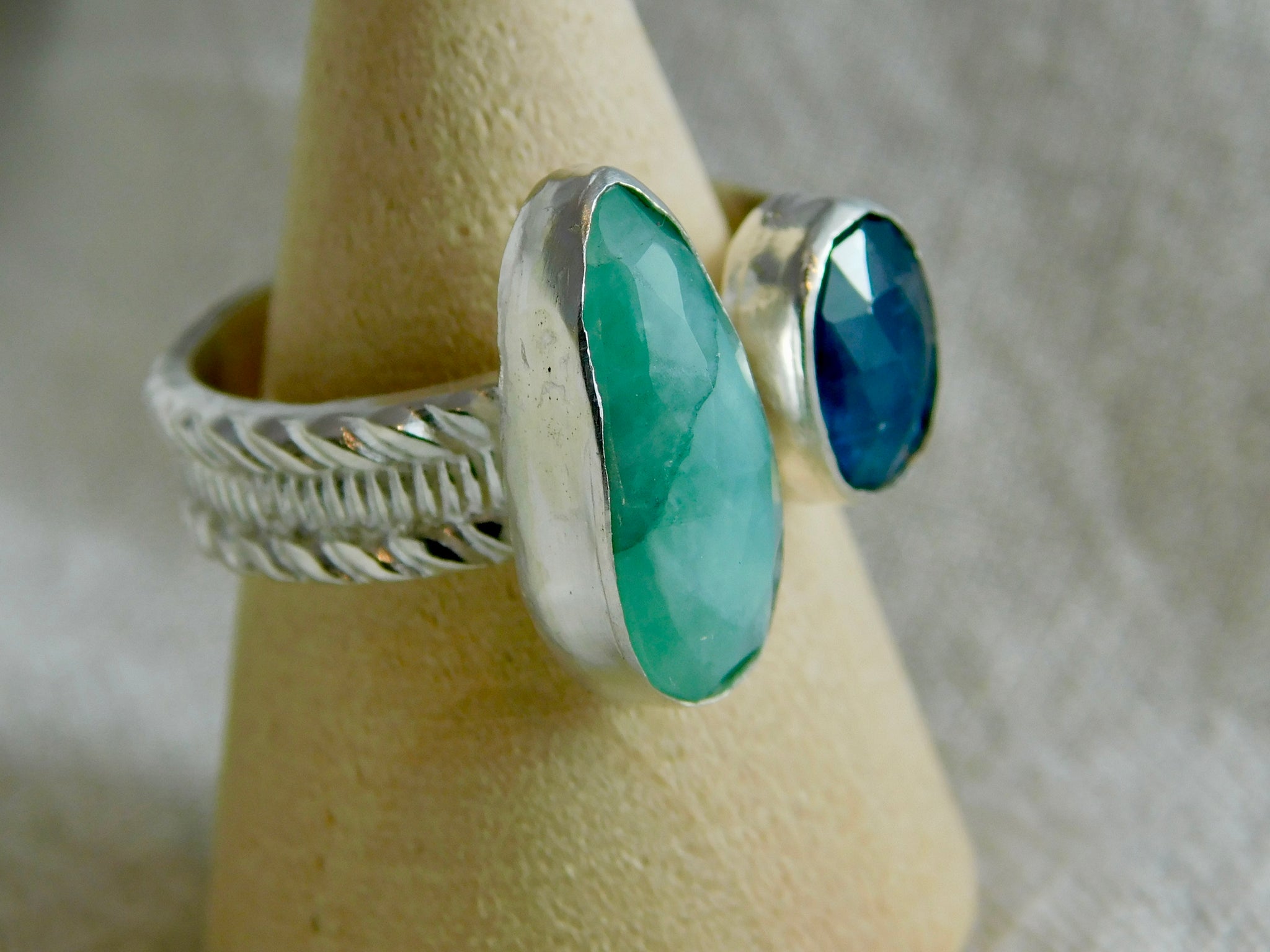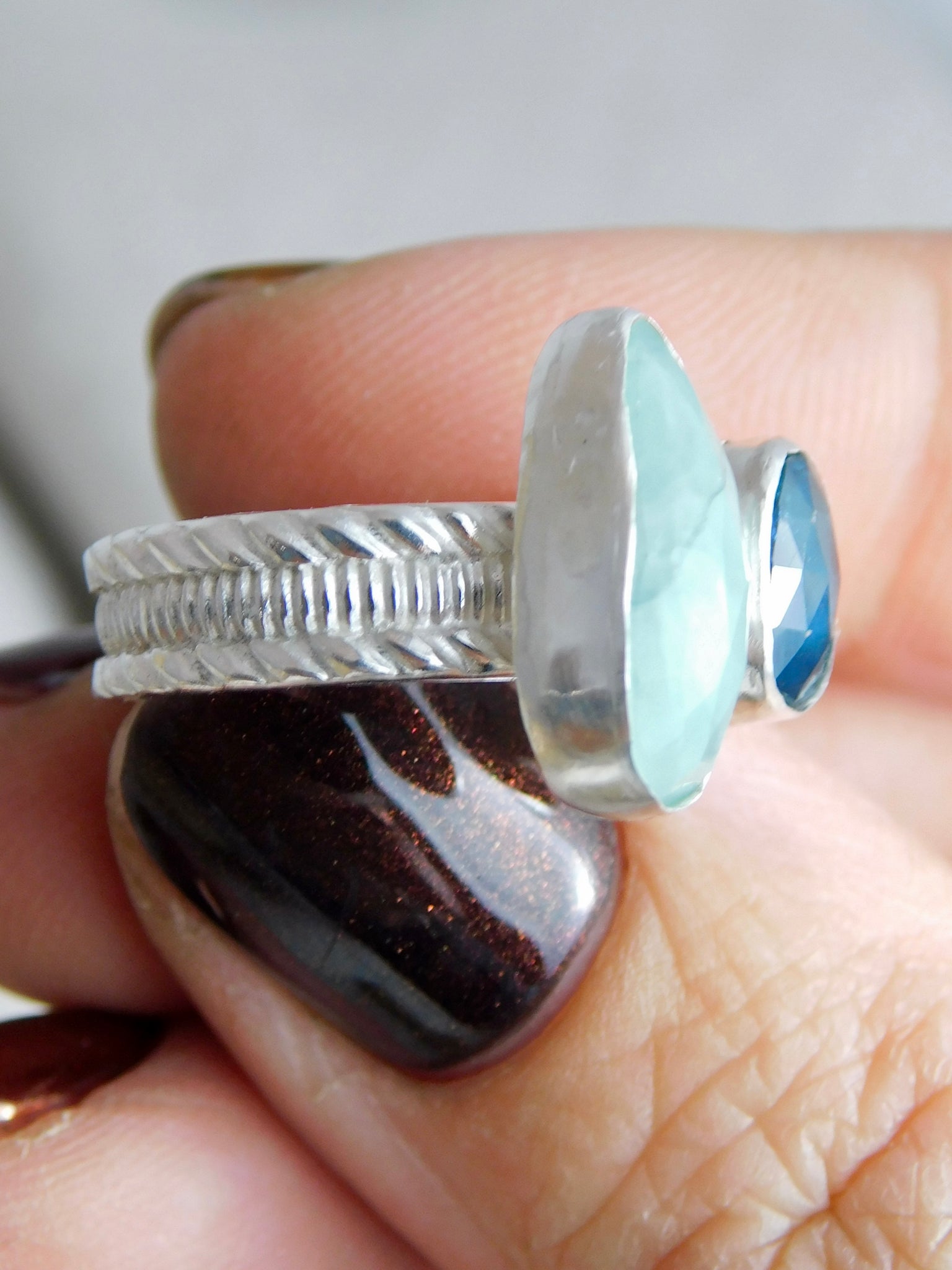 This lovely ring comprises of a small, bright and beautiful piece of Rose Cut Aqua Kyanite and a Pastel pale green piece of rose cut Emerald, and I am so pleased with this colour combo I love.